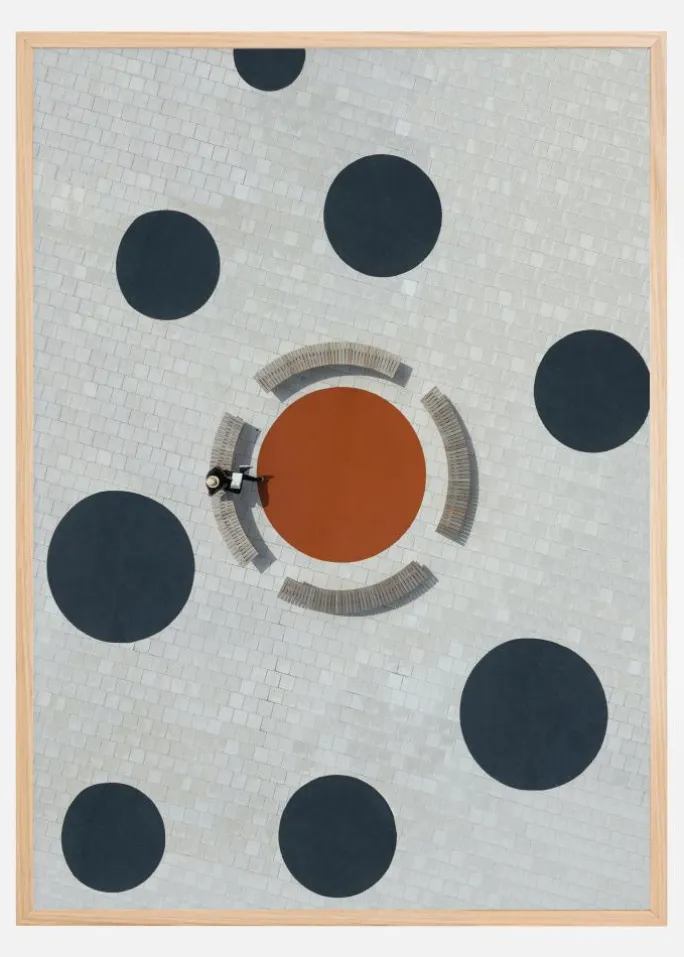 Denne konceptuelle plakat fanger et distinkt, fugleperspektivbillede af en læsende person omgivet af en symmetrisk og grafisk komposition. Det abstrakte design af den hvide flisebelagte overflade, punkteret med store sorte cirkler og en central rustfarvet cirkel med bænke giver en stærk visuel kontrast. Denne plakat er ikke kun en hyldest til design og arkitektur, men også en legende fortolkning af dagligdags scener.