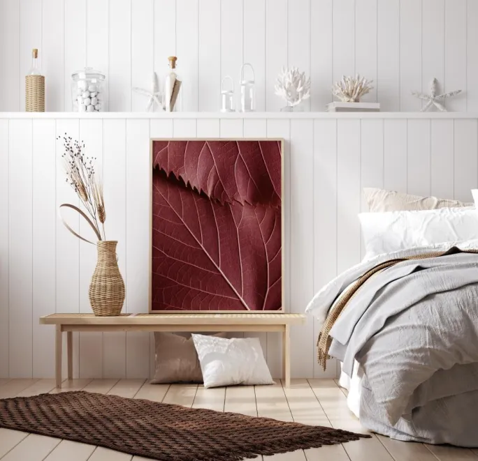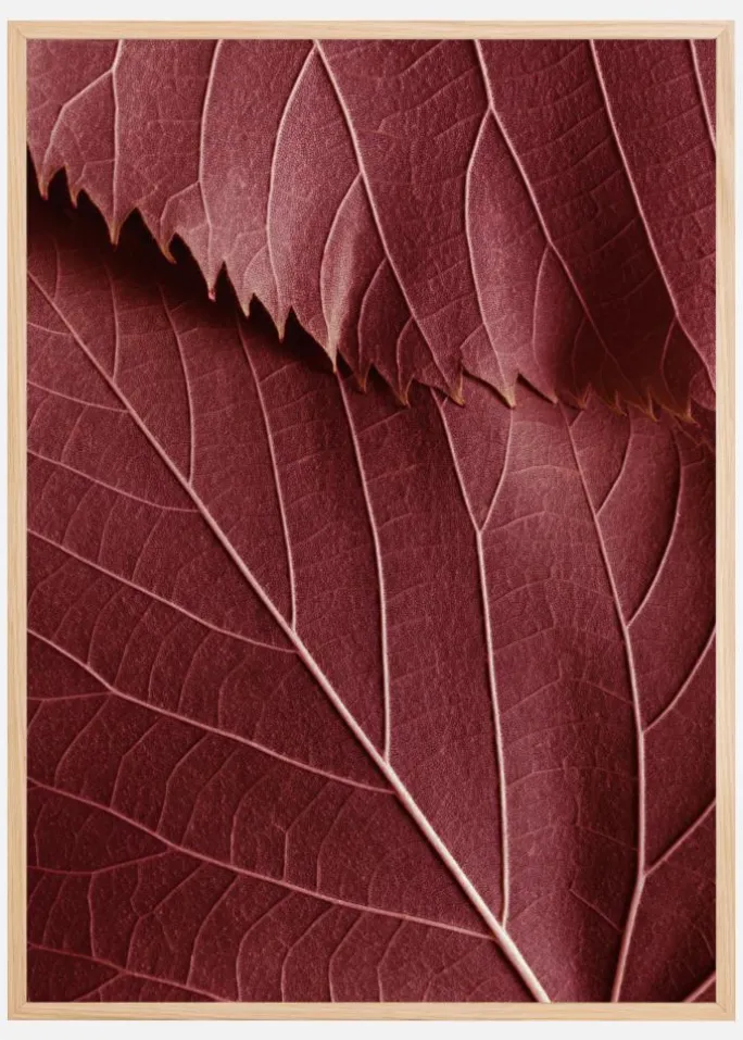 Botanisk fotokunst af mørkerøde blade med livlige mønstre. En stilren plakat i varme nuancer i en stil, der gør den perfekt at kombinere med andre herlige motiver på en større billedvæg.