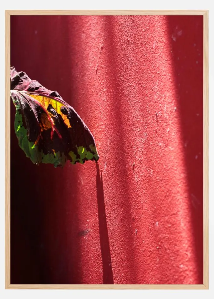 Dette dristige og kunstneriske plakat fanger en dramatisk kontrast, der vil tilføre karakter og dybde til dit rum. Et ensomt blad med rige, mørke farver og strejf af levende grønt og orange, fremtræder stærkt mod en tekstureret, dybt rød baggrund. Lysets spil på bladets overflade skaber en dynamisk skygge og fremhæver de komplekse farveskift og den organiske form.