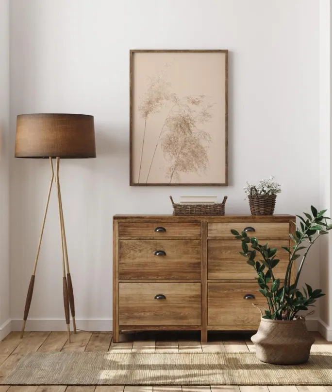 En naturplakat af rørgræs mod himlen. Græsset står højt mod den lyse pastelfarvede himmel, og du kan mærke freden og tomheden i dette naturprint.