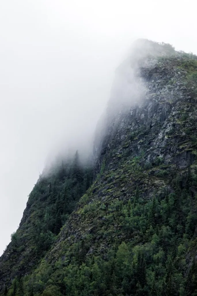 En storslået plakat af siden af et bjerg komplet med træer. Toppen af bjerget er lidt skjult af en sky, hvilket bidrager til at skabe en mystisk stemning. Forestil dig at klatre op på denne top for at se udsigten, når du tilføjer dette til dit hjem.