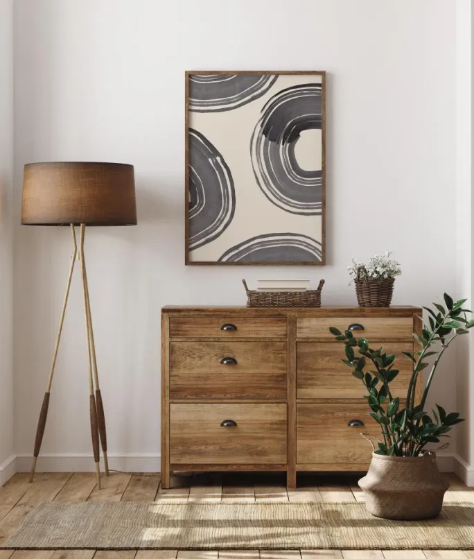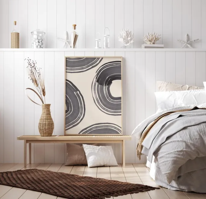 En mønstret plakat med forskellige hvirvlende mønstre i grå farver. Disse cirkler er livets ringe, da alting går i en kæmpe cirkel for at komme tilbage til starten. Cirklerne består af forskellige tykkelser på en hvid baggrund. For at få en kunstnerisk stemning kan du kombinere den med din fed yndlingsfarve på væggen.