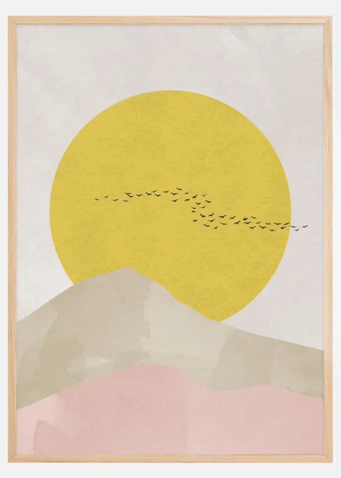Stig op over det daglige med vores inspirerende plakat, der skildrer de sublime Rocky Mountains under en storslået solopgang. Dette kunstværk er en harmonisk sammensætning af bløde pastelfarver og dristige former, hvor solens varme gule cirkel stråler over de kuperede, abstrakte former af bjergene. Den rolige procession af fugle, der flyver i silhuet mod den gyldne himmel, tilføjer en følelse af frihed og eventyrlyst til motivet. Denne plakat er en subtil påmindelse om naturens ubestridte skønhed og kraften i nye begyndelser.