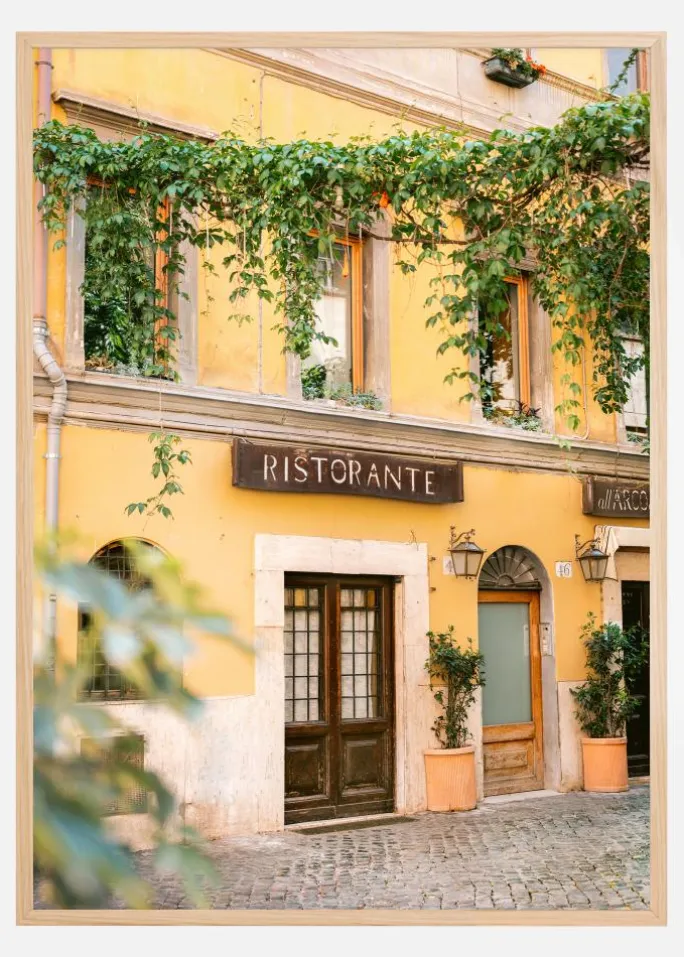 Denne stemningsfulde plakat afbilder en charmerende restaurantfacade, som fanger essensen af et livligt europæisk kvarter. Den varme gule tone på væggen harmonerer med den naturlige grønne beplantning, der pryder vinduerne, og skaber en indbydende og hyggelig atmosfære. Skiltet “RISTORANTE” giver en autentisk følelse og fremkalder billeder af en skjult perle, hvor mad og kultur mødes. De rustikke detaljer i døren og vinduerne, sammen med de terracottafarvede potter, komplementerer hele scenen og byder indenfor til en verden af smagfulde oplevelser og afslapning.