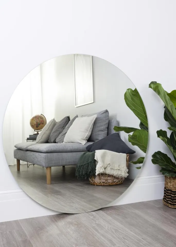 110 cm Ø rundt spejl som tilhører en serie af runde spejle. Spejlet er ekstremt tyndt, stilrent og passer ind i alle typer af rum og indretningsstile.