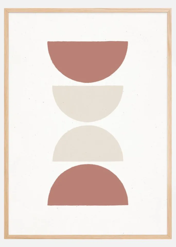 Denne sofistikerede plakat, med titlen ‘Rust and Sand – Lungo’, fanger øjet med sit enkle men dristige arrangement af halvcirkelformer. De ligger stablet oven på hinanden i en beroligende symmetri, hvilket skaber en vertikal dynamik på den hvide baggrund. Med sin diskrete palette af rustent rødt og sandfarvet beige er denne print en hyldest til det sublimt enkle og giver en varm og jordnær følelse til ethvert rum, den placeres i.