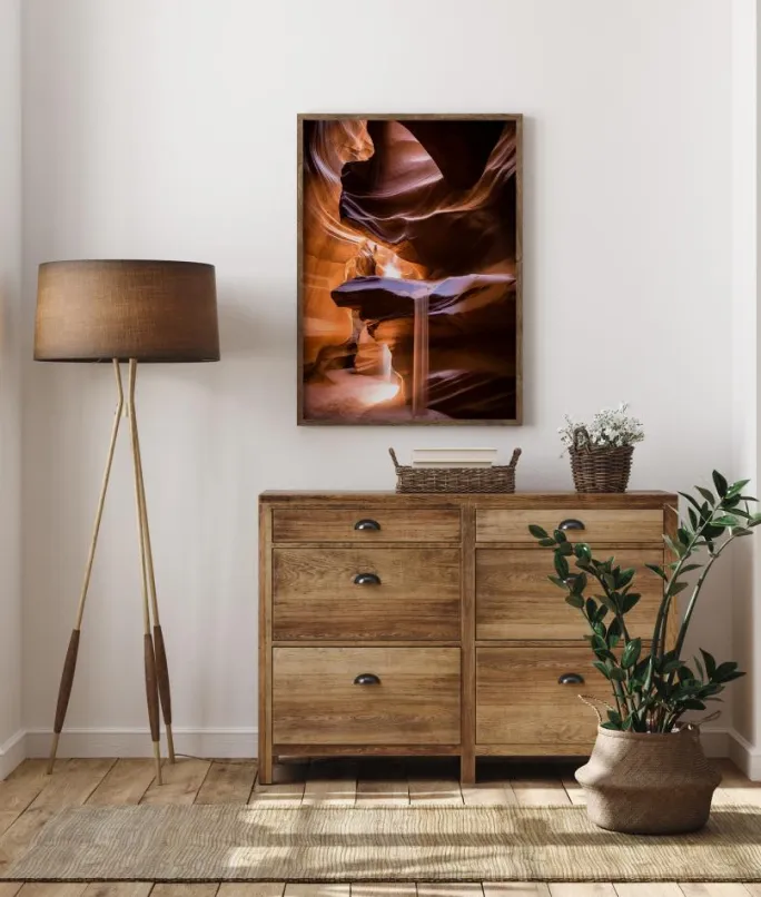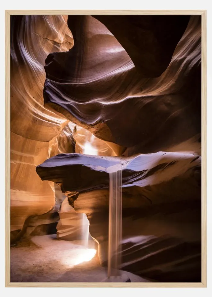 En dramatisk plakat af det indre af en klippehule med sand, der falder ned i kaskader ned på gulvet. Sollyset siver ned i hulen og oplyser de dybrøde klipper og skaber en fantastisk varm atmosfære. Det strømmende sand ligner et vandfald i dette fascinerende billede.