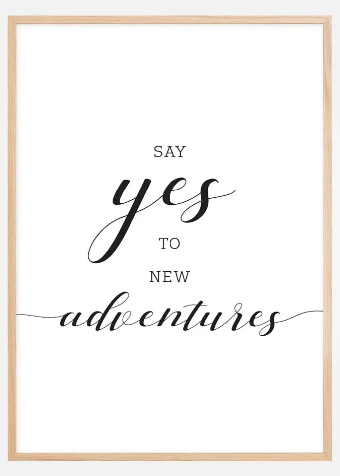 En kalligrafisk plakat med et sjovt rejsecitat i en flydende hånd og stærk skrivemaskineskrifttype. Gør dig klar til at sige ja til nye eventyr, når du hænger dette enkle sort/hvide citat op derhjemme. Bliv inspireret hver dag, når du kigger på denne sætning.