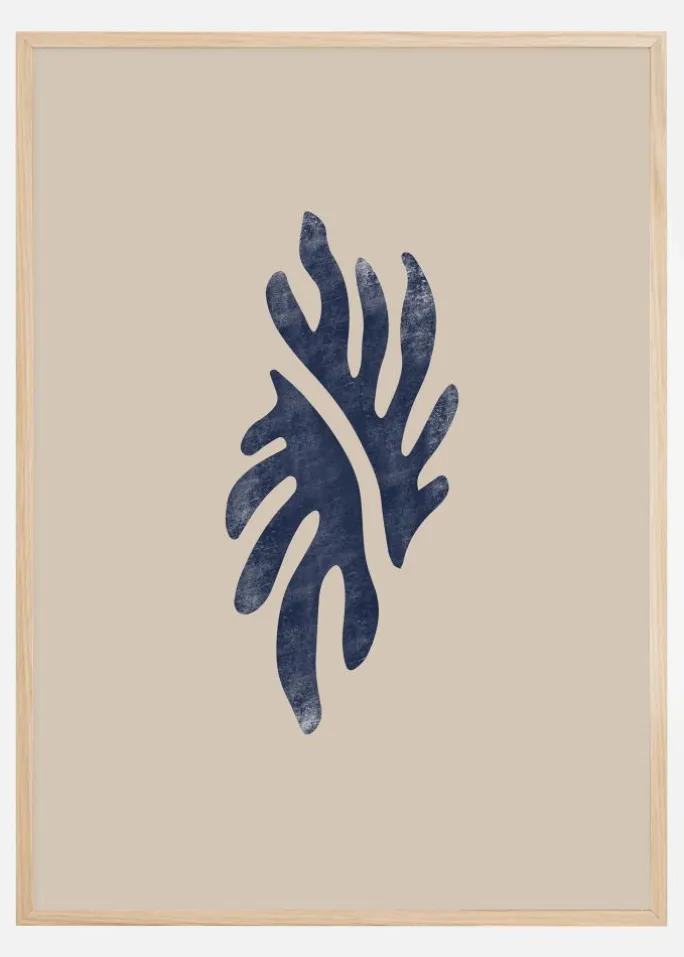Denne elegante plakat med sin abstrakte bladvækst i en dyb blå nuance mod en beroligende beige baggrund, fanger essensen af naturlig skønhed i en forenklet form. Designet er både moderne og organisk, hvilket skaber en følelse af ro og afslappet elegance. Motivet ville være en smuk og nutidig vægdekoration i ethvert rum, fra stue til soveværelse eller kontor.