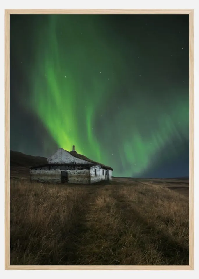 En fantastisk plakat med et lysende grønt og gult polarlys over et lille hvidt hus. Nordlysets klare farver synes at bevæge sig og flimre, mens du stirrer på denne fascinerende scene. Tag imod naturens storhed, og få dette naturfænomen ind i dit hjem for at opnå æterisk skønhed.