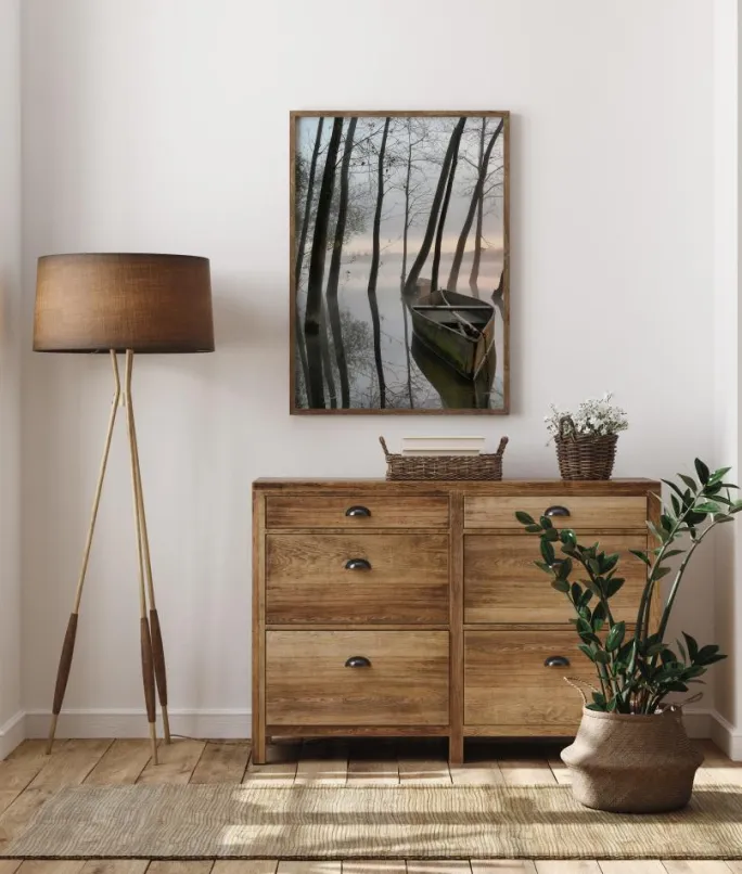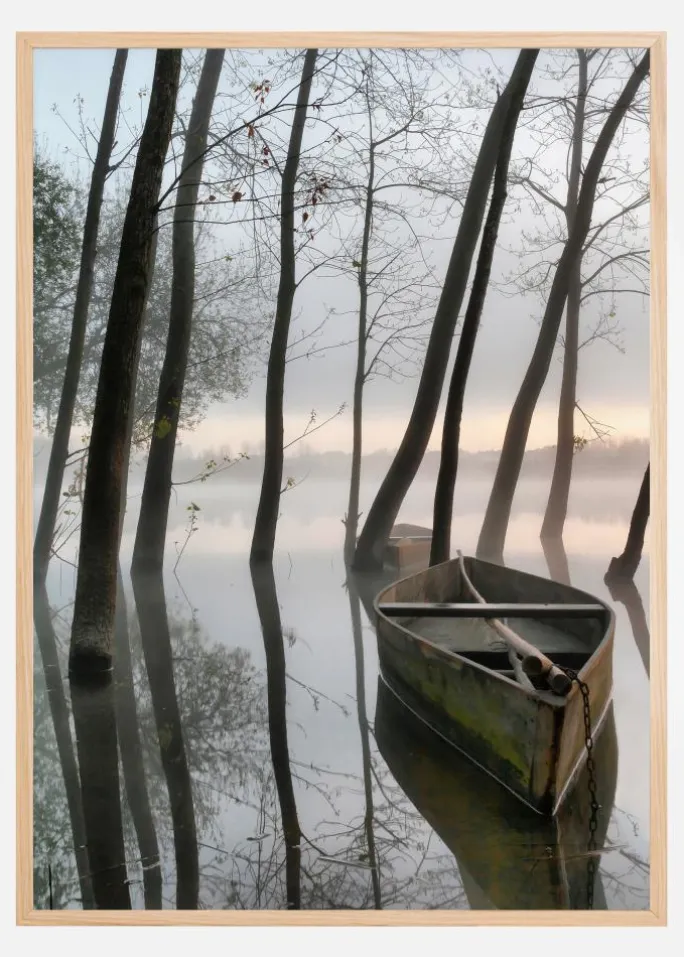 En rolig plakat af en morgengry på en klar sø med træer, der rejser sig op fra vandet. En båd ligger også fortøjet på vandet, med front mod træerne. Alting står stille og laver perfekte refleksioner i vandet, mens den bløde pastelfarvede himmel bliver lysere i takt med solopgangen. Nyd denne ro i den tidlige morgen.