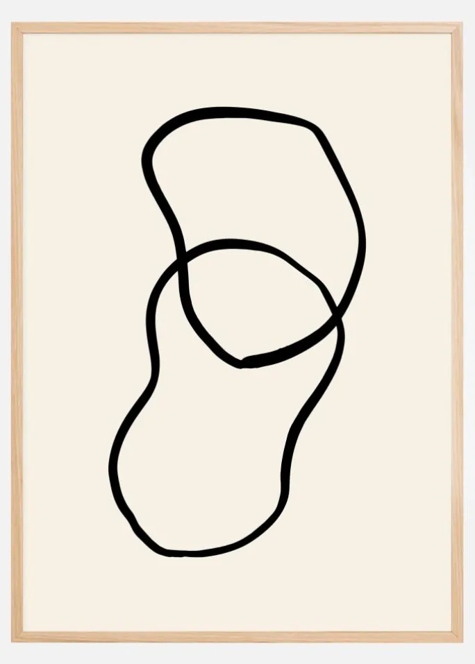 En abstrakt plakat af to former, der fletter sig sammen. To klumpede former er tegnet med fede sorte linjer og krydser hinanden for at skabe en tredje form, der skærer hinanden. Tilføj dette sjove sort-hvide design til en farverig væg for at skabe en moderne kunststemning i dit hjem.