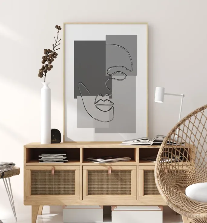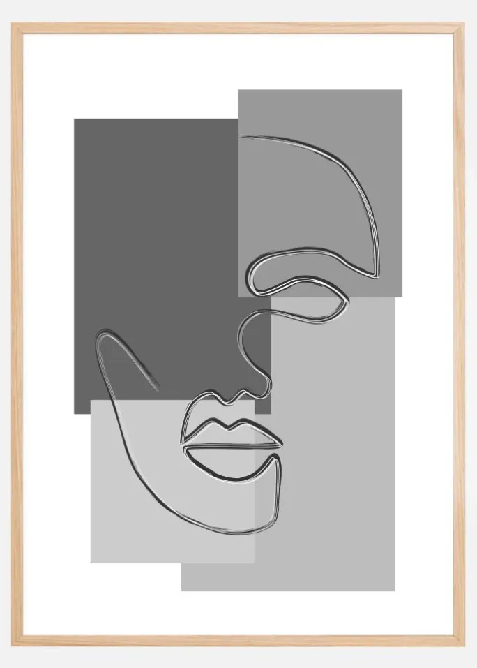 En abstrakt plakat med et ansigt tegnet oven på tre forskellige farvede rektangler. En enkelt flydende linje tegner ansigtet fra øjet til næsen og munden. Ansigtet sidder oven på fire rektangler, der hver især har en anden grå tone for at give et mere modernistisk look.