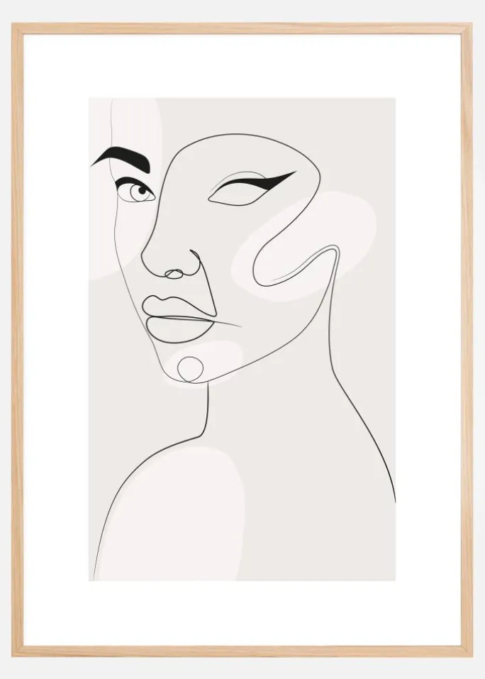 En modernistisk plakat af et abstrakt kvindeansigt. Tynde linjer hvirvler hen over siden for at skabe hendes ansigt. Det ene øje stirrer ud på dig med stærke detaljer. Det andet er ufuldstændigt, men har en smuk eyeliner på plads. Hun har et overmodigt udtryk, mens hun ser på dig i dette elegante minimalistiske værk.