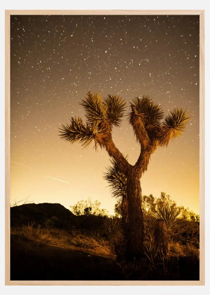 En natteplakat af en stor kaktus i ørkenen, der står højt mod en nattehimmel fuld af stjerner. Kaktussen er badet i en blød gylden glød, mens solen går ned i horisonten. Stjernerne blinker blidt over himlen på en blød, varm himmel. Nyd varmen på denne nathimmel i ørkenen.