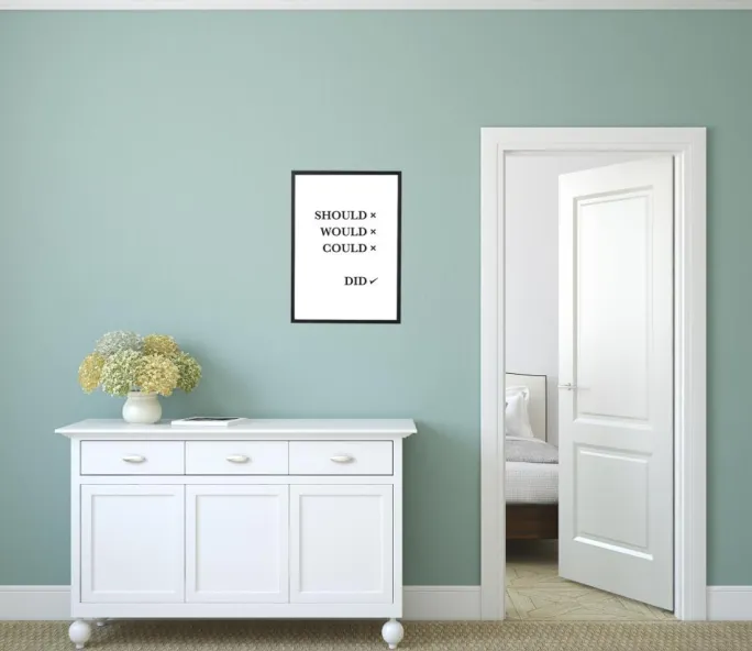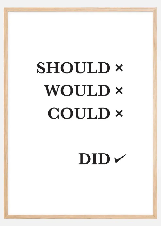 Hvorfor gøre alle de brillante idéer, du får, komplicerede med hæmmende tanker? Det er da bare at gøre det! Med denne plakat på væggen er der ikke længere nogen undskyldninger. Prints er hvid med sort posters bestående af en liste med teksten “Should Would Could”, hvor hvert ord har et kryds ved siden af. Nederst er ordet “Did” med et flueben ved siden af. Det sort-hvide design ser meget godt ud med en farverig ramme. Da plakaten findes i flere forskellige størrelser, finder du en både til skrivebordet og til væggen.