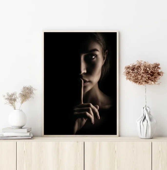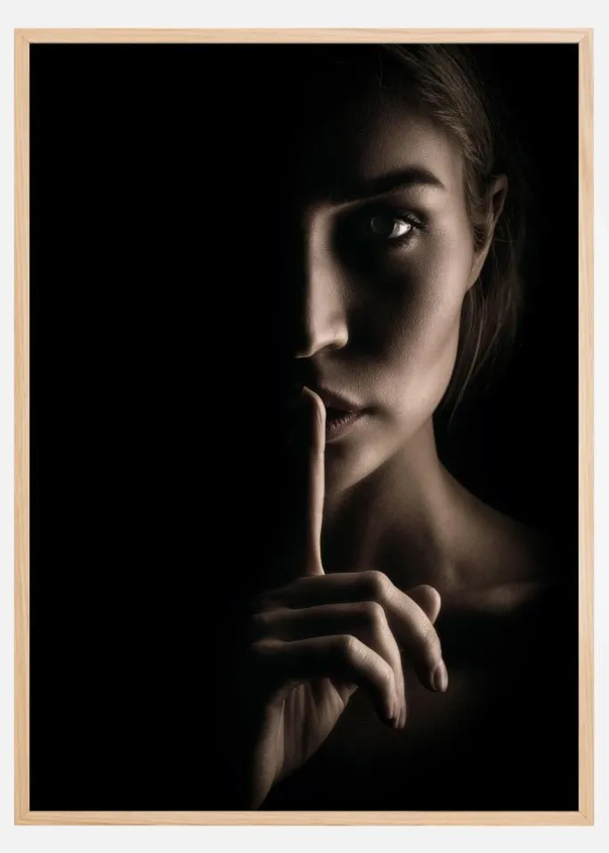 En mystisk portrætplakat af en kvindes ansigt halvt i skygge. En finger er løftet til hendes læber for at holde dig stille, mens hun stirrer lige ind i dine øjne. Den dramatiske belysning skaber en blød glød på den ene side og dykker hende ned i skygger på den anden side.