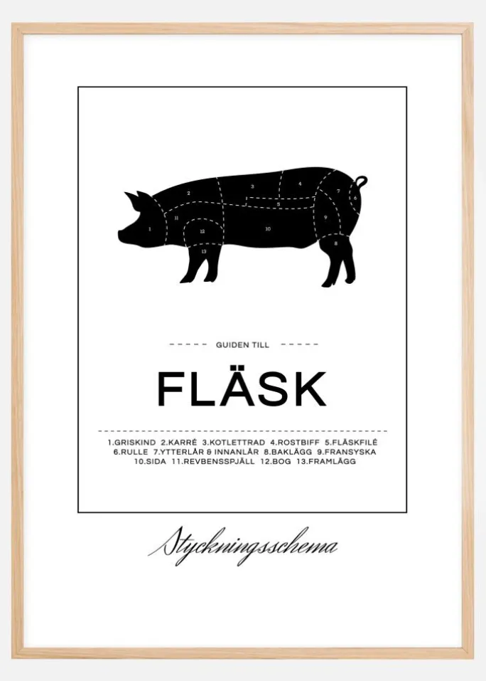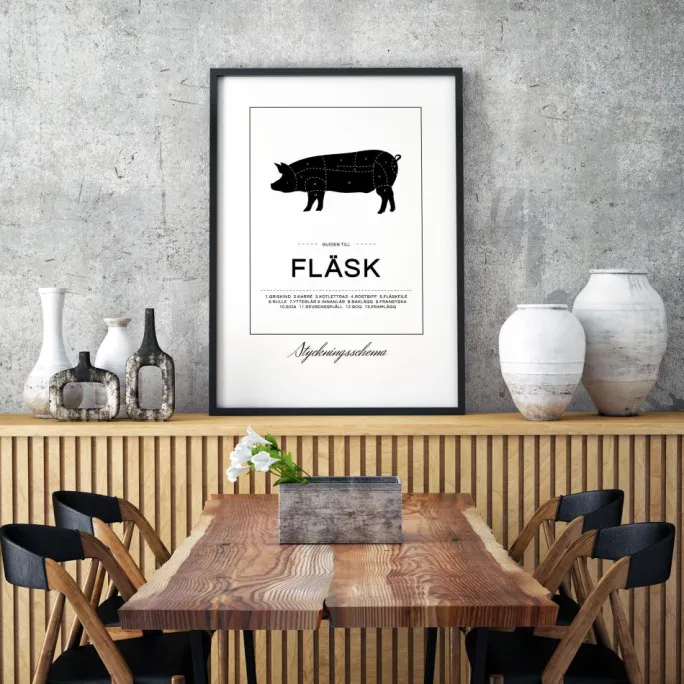 Det er ikke kun slagtere, der har lov til at hænge et flot udskæringsskema på væggen. Her har vi en sort-hvid plakat med et tryk, der forestiller en gris med markeringer, som viser, hvor du finder diverse svinedelikatesser. Under grisen er teksten “Guiden til Svinekød” trykt sammen med en pæn liste over grisens dele. Tekststykkerne er adskilt af to stykker stiplede linjer, og motivet er indrammet af en enkel kvadrat. Under kvadraten står teksten “Udskæringsskema” skrevet med en snirklet skrifttype.