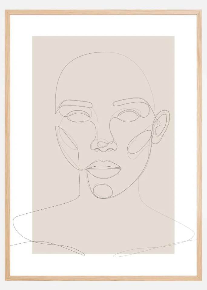En enkel abstrakt plakat af et ansigt skabt ved hjælp af tynde linjer. Ansigtet stirrer lige ud og er skabt ved hjælp af en enkelt lang flydende linje, der tilføjer alle ansigtets hovedtræk på en fascinerende måde. Plakaten er sat på en grå baggrund og fungerer bedst på en neutral væg.