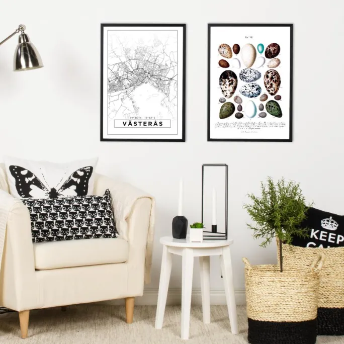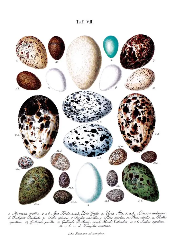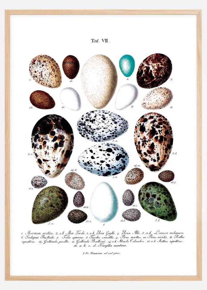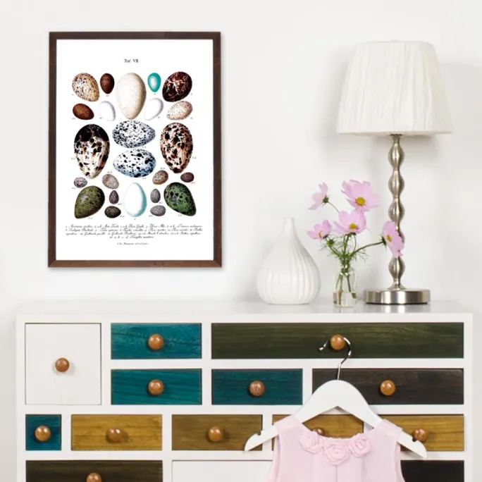Kan du lide farve og form? Så har du måske tænkt på, at naturen er den mest dygtige designer! Denne print er en kopi af en gammel skoleplakat, der skildrer forskellige fugleæg. Under de farverige æg finder du numre, der henviser til en beskrivende, latinsk tekst nederst. Teksten informerer om, hvilken fugleart de respektive æg tilhører. En meget smuk print for dig, der kan lide at kombinere vintage med naturfarver! Da printet findes i flere forskellige størrelser, finder du nemt en, der passer lige til dig. Komplementér gerne med en flot ramme fra vores store sortiment.