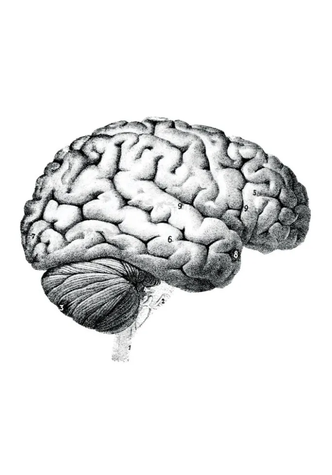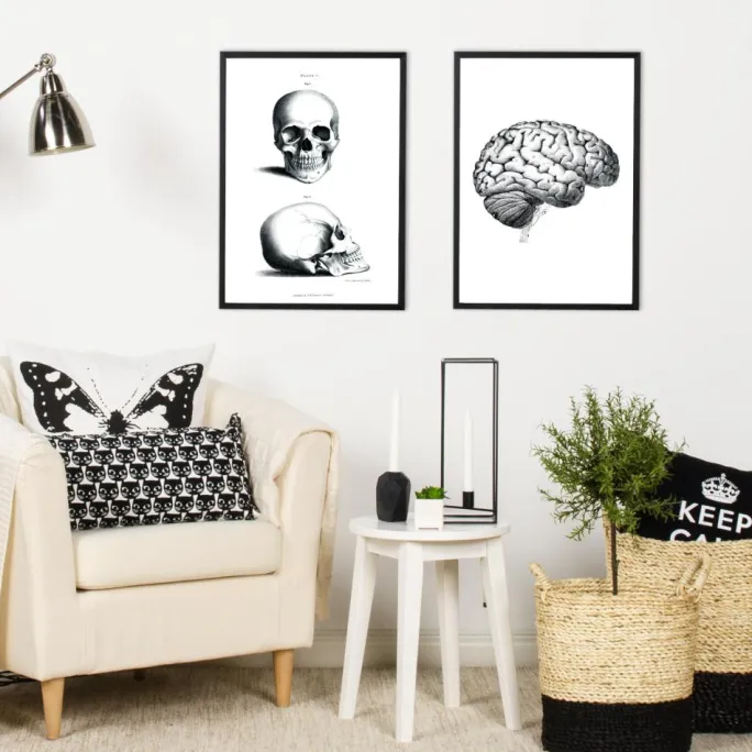Gør din interiør mere spændende med forskellige skoleposters med vintagefølelse! Denne print er en kopi af en gammel tegning, der viser en hjerne med numre ved de forskellige dele. Tegningen er taget fra en lærebog i anatomi. Da den er sort-hvid, er den nem at matche med en ramme, der passer godt sammen med resten af indretningen. Printen findes i en række forskellige størrelser, så du nemt kan finde en, der passer til netop dit hjem.