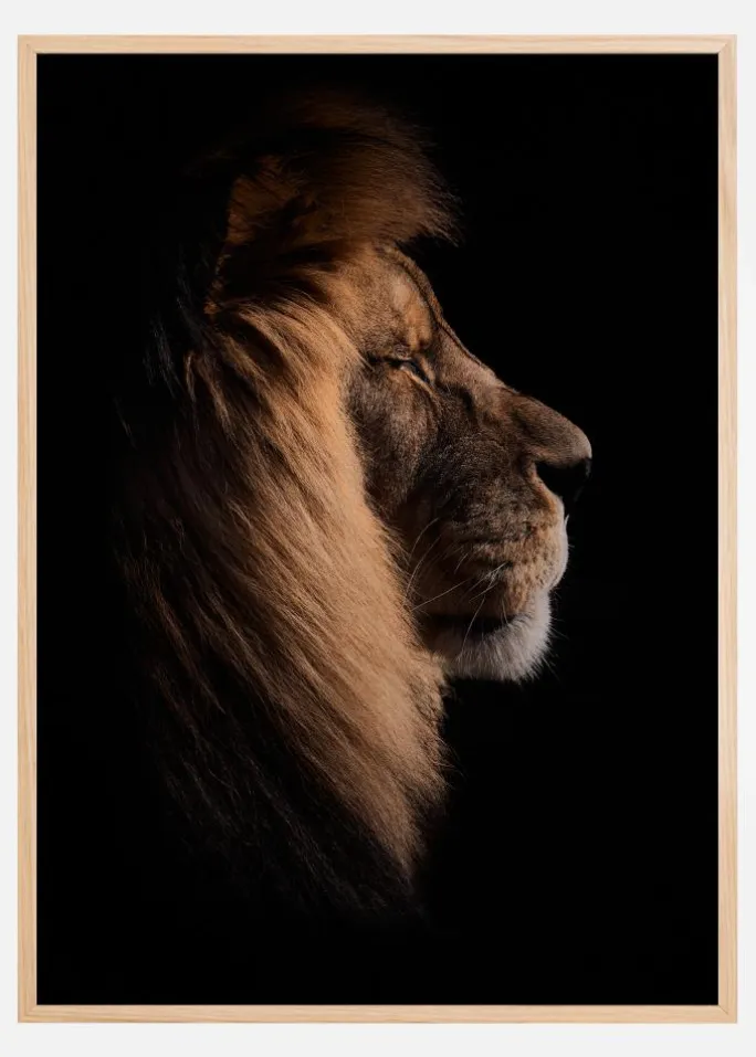 Mød majestæten af den afrikanske savannes ubestridte konge med denne mægtige plakat. En løves profil, fanget i et intimt portræt mod en sort baggrund, viser dyrets stolte holdning og værdige ro. Hans tykke manke i nuancer af guld og brunt lyser op i kontrast til mørket, hvilket fremhæver hvert strå i hans imponerende manke.