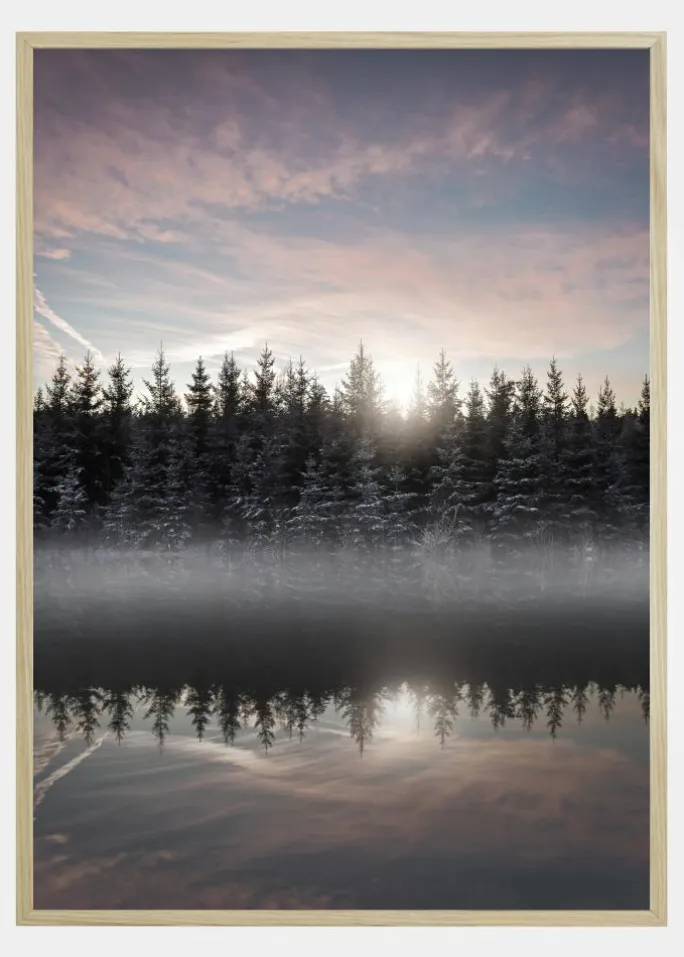 En magisk plakat af en tåget sø i det tidlige morgenlys. Sneklædte træer står på bredden, delvist dækket af tåge. Træernes refleksioner kan findes i søens bløde pastelfarver. Over trætoppene stiger solen op og kaster et blødt skær på den lyserøde og blå himmel, hvilket giver en fredfyldt stemning.