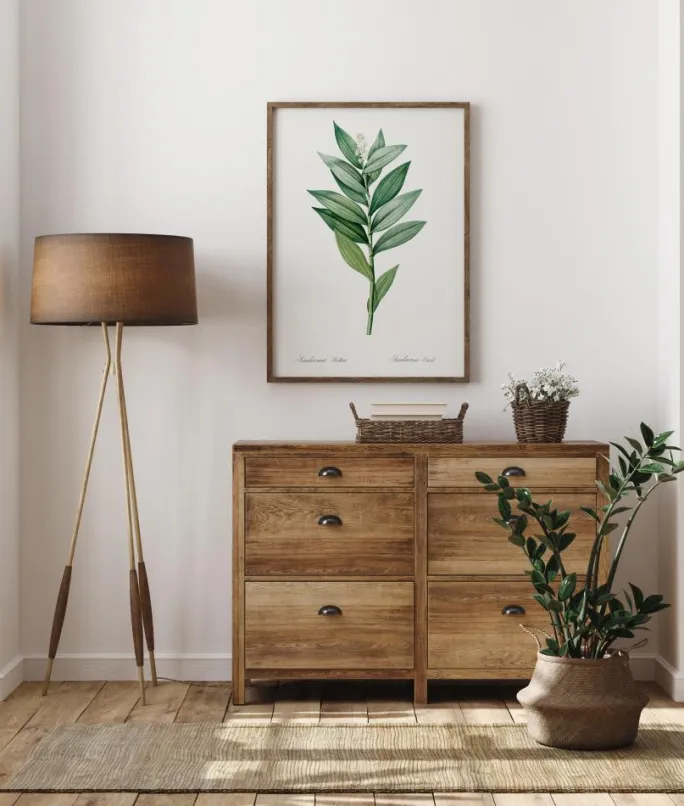 En botanisk plakat af de grønne blade af Smilacina stellatas. Kunstneren fanger de detaljerede årer på hvert blad, der skaber en fantastisk glans. Delikate små hvide blomster blomstrer i toppen af grenen og skiller sig knap nok ud mod den hvide baggrund.