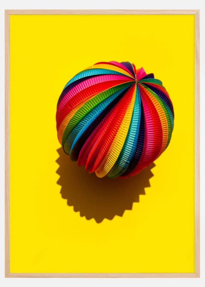 Denne livlige og farverige plakat præsenterer en udsmykket papirskabelse mod en strålende gul baggrund, hvilket fremkalder en øjeblikkelig følelse af glæde og energi. Den er en fest for øjnene og en måde at tilføje en farverig accent til ethvert rum. Denne plakat er perfekt for dem, der ønsker at indsprøjte legesyge og en legesyg twist i deres indretning.
