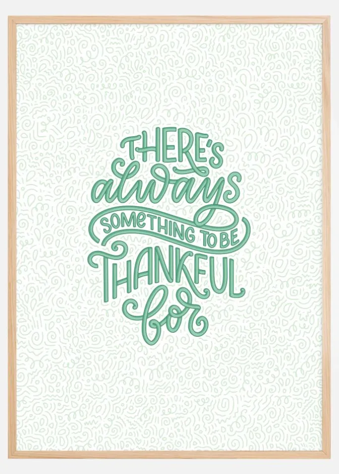 Denne inspirerende plakat er en opfordring til optimisme og taknemmelighed, perfekt til at sprede positive vibrationer i dit hjem eller på din arbejdsplads. Med en livlig grøn tekst, der lyder “There’s always something to be thankful for” mod en detaljeret hvid baggrund fuld af indviklede linjer og mønstre, opfordrer den til en positiv livsindstilling og refleksion.