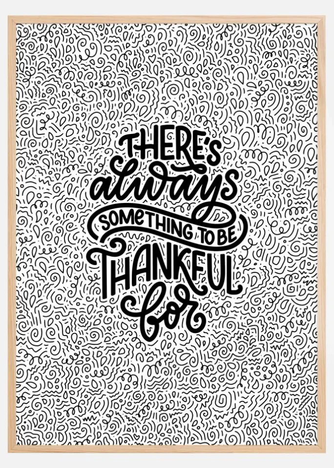 Denne stilfulde og inspirerende plakat er en hyldest til taknemmelighedens kraft i vores hverdag. Den flot håndskrevne tekst “There’s always something to be thankful for” er indrammet af et hav af detaljerede, hvirvlende mønstre, der fylder baggrunden og skaber en dynamisk og fængslende kontrast. Sort-hvid i farveskalaen, er dette print en tidløs tilføjelse til ethvert rum og en påmindelse om, at der altid er grunde til at føle taknemmelighed.