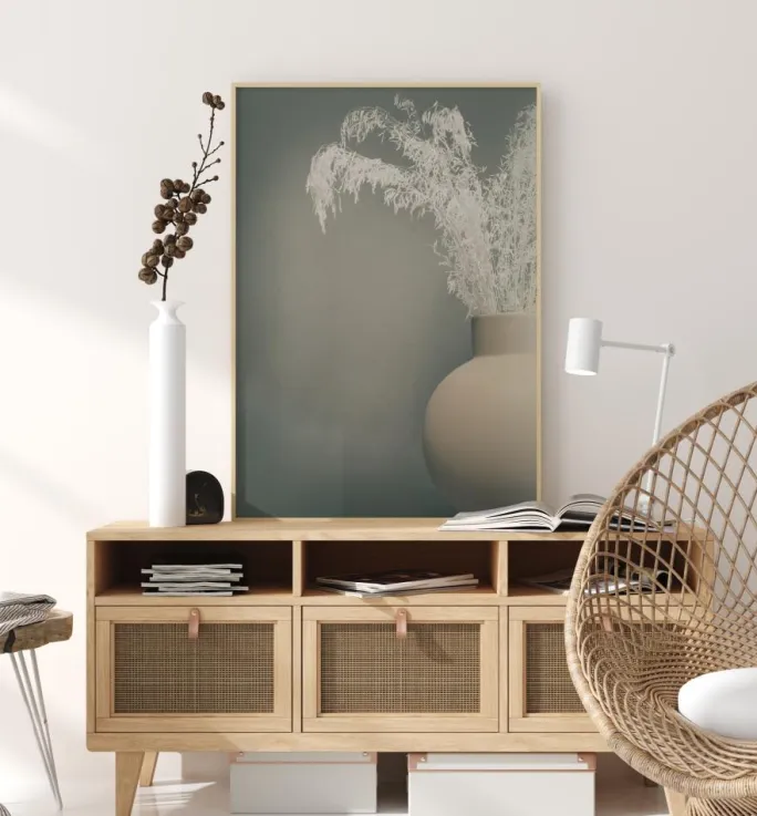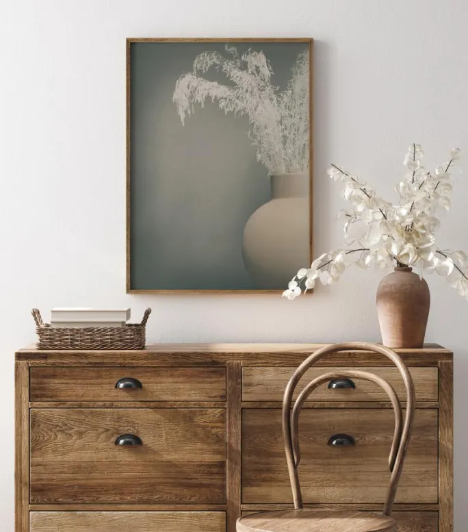 En livstegningsplakat af en hvid vase med nogle bløde blade, der sidder mod en lys blågrå væg. Vasen sidder til højre i billedet, og de hvide blade dingler blødt nedad og skaber en virkelig blød følelse. De blide pastelfarver er beroligende og fredfyldte.