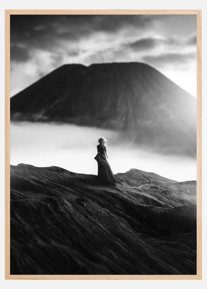 En dramatisk plakat med en kvinde, der kigger ud over et tåget vulkankrater. Over den skyede planet er der mørke skyer, som skaber fornemmelsen af en forestående storm. Skab spænding og dramatik med dette billede.