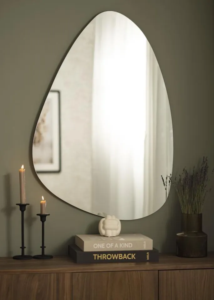 Denne spejl er perfekt for dig, der søger et elegant spejl i minimalistisk stil. Den asymmetriske form kombineres med en tynd spejlglass og kanter uden ramme, hvilket giver en meget elegant helhed. På bagsiden findes vægbeslag.