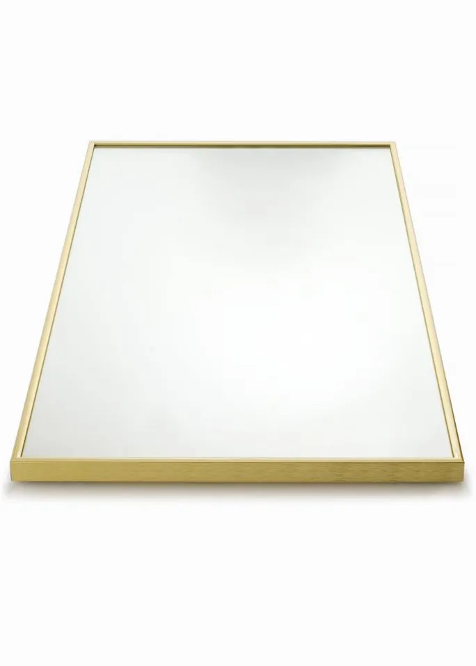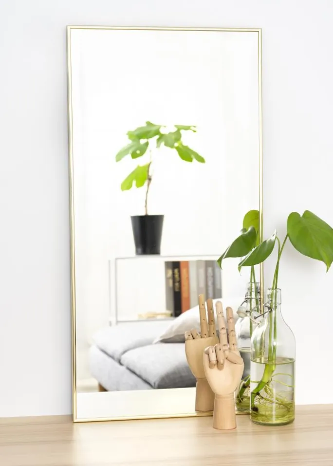 Spejlet har en guldfarvet aluminiumsramme og kan let hænges op på væggen takket være de smarte vægbeslag. Mål: 40 x 80 cm