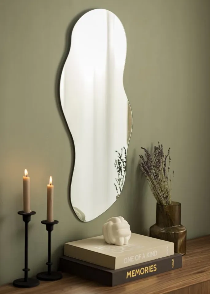 Thin Cloud er et tyndt, aflangt spejl med en unik bølgeform. Det bølgende design skaber et blødt udtryk, der matcher godt sammen med møbler med lige linjer, som borde, kommoder og bogreoler. Denne vægspejl måler 40×80 cm og kan monteres på dine vægge ved hjælp af vægbeslaget på bagsiden.