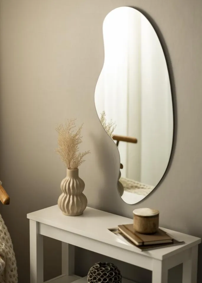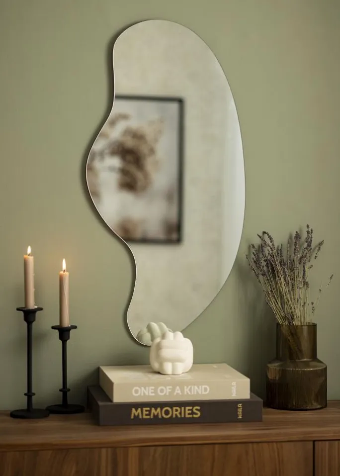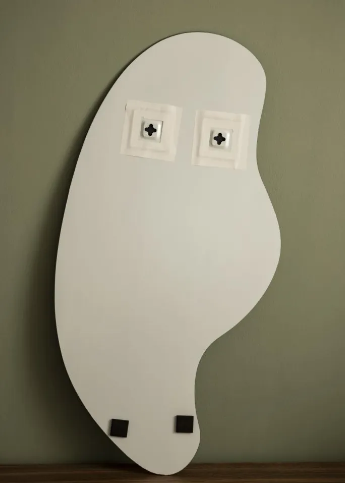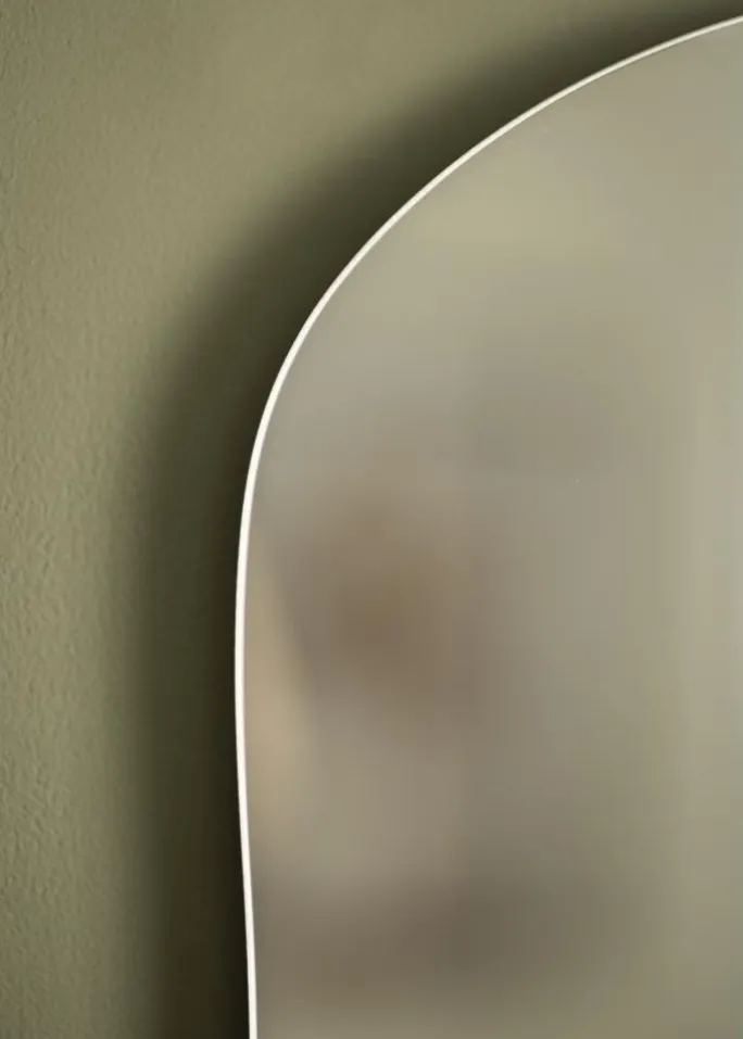 Wavy Cloud er et spejl med unikt design og høj elegance – perfekt for dig, der søger en personlig indretningsdetalje. Den specielle udformning, med en klassisk afrundet side og en side med bølgende bølgeform, skaber en stilfuld helhed. Spejlet mangler ramme og har et tyndt spejlglass på kun 4 mm, hvilket yderligere hæver følelsen af elegance. Denne vægspejl er 40×80 cm stort.