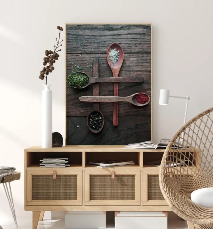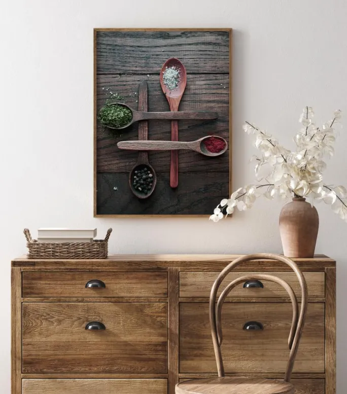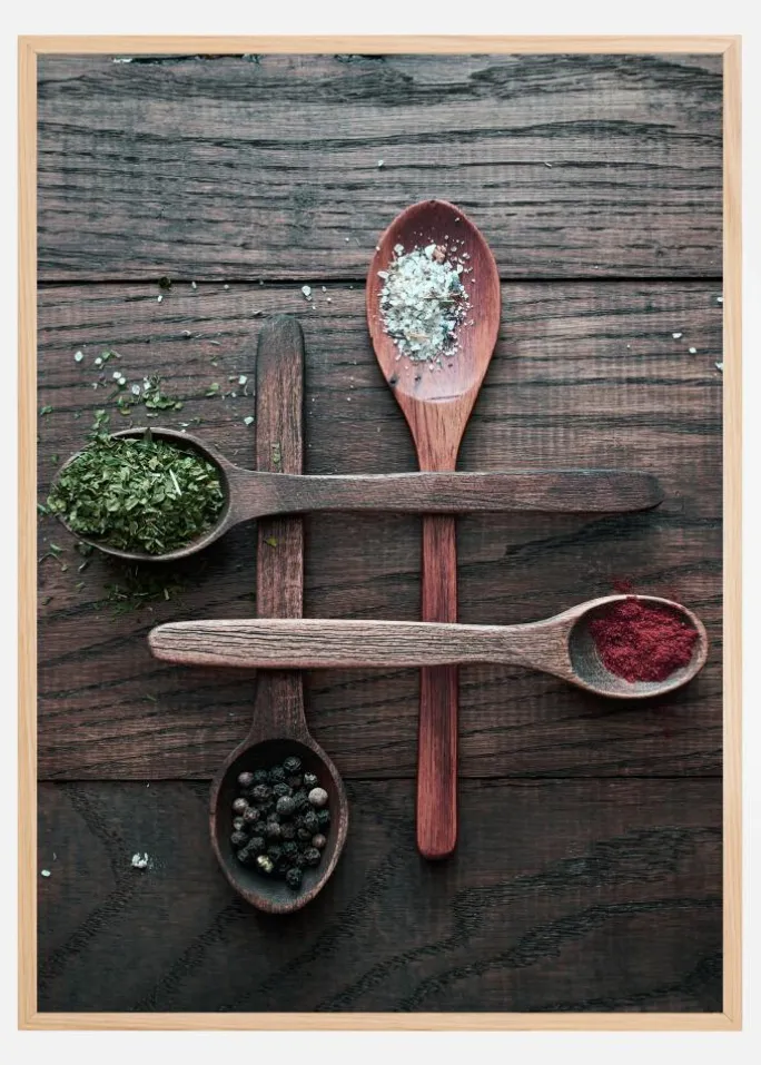 En stillebenplakat med fire træskeer med hver sit krydderi. De fire skeer krydser hinanden på kryds og tværs og danner et gitter på et rustikt træbord. Urter og krydderier vælter ud fra hver skål og skaber en sjov madlavningsstemning, perfekt til inspiration i køkkenet.
