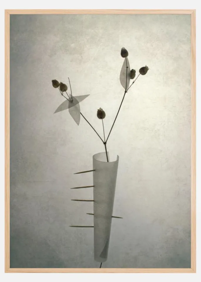 En finurlig plakat af en tynd vase med en spidsklumpet blomst indeni. Baggrunden er lysegrå med et stærkt lysglimt, der belyser denne spidse plante og skaber abstrakte former. Hvis du vil give den mere pift, kan du sætte den på en farverig væg.