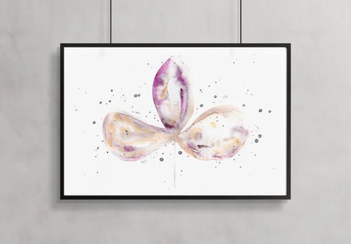 En lys plakat med tre lilla kronblade i midten af en hvid baggrund. Forskellige lilla toner skaber disse bløde, ekspansive blade. Punkter af lilla maling vælter ud fra bladene for at skabe en mere abstrakt stemning. Få farverne frem ved at hænge den op på en lilla væg.