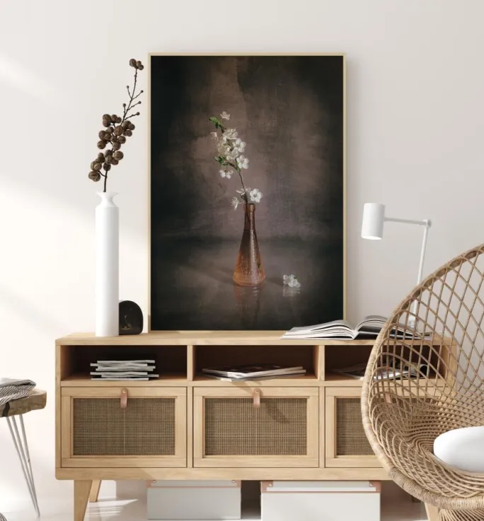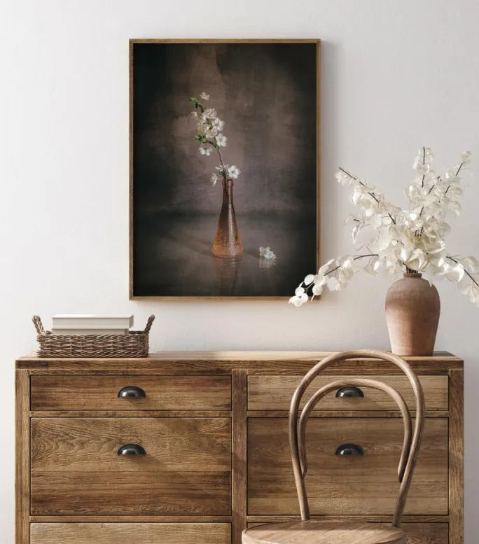 En forårsplakat med hvide blomster i en tynd brun vase. Vasen kaster skygger i to retninger og skaber et lyst fokuspunkt, hvor de stjerneformede blomster springer op mod væggen bagved med mørkebrune, brede penselstrøg. Overvej dette elegante forårsstilleben.