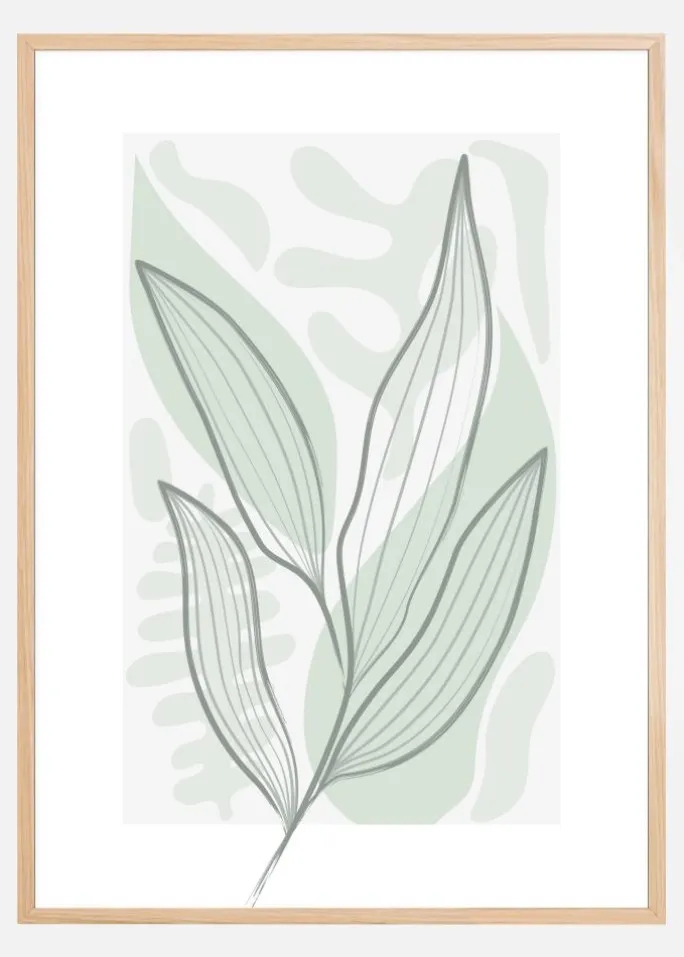 En abstrakt plakat med blade på en enkel grøn baggrund med forskellige bladformer og -designs. Ved hjælp af bløde grønne og grå farver giver det enkle bladdesign, der er skitseret med en stærk grå linje, en kraftig forårsstemning, der giver en blød fornemmelse, som kan tilføjes til ethvert rum i huset.