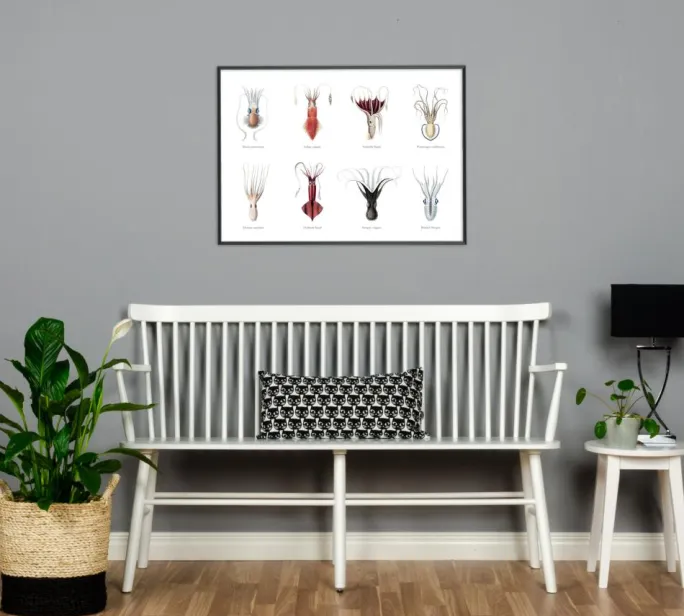 Blæksprutten er sandelig et interessant væsen. Vidste du for eksempel, at den har 3 hjerter? Eller at dens intelligente hjerne er bittesmå, selvom den gigantiske ting, der ser ud som et hoved, synes at indeholde en kæmpestor hjerne? Desuden findes der næsten 800 arter af blæksprutter! Denne fine vintageplakat fremstiller 8 af dem – ingen den anden lig, men alle lige fascinerende. De gamle tegninger har søde, veludførte detaljer, og under hver art står navnet.
