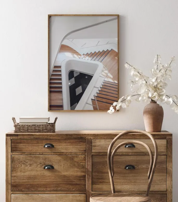 En interiørplakat af et sæt trapper i en trekantform. Trinene er brune med væggene og gelænderet i hvidt med forkromede gelændere. De svinger nedad og rundt til et sort og hvidt flisegulv nedenunder. Kig ned fra oven i dette Escher-lignende billede og forestil dig, at du går over disse smukke trapper.