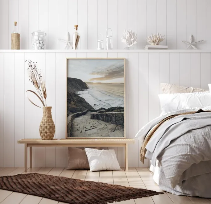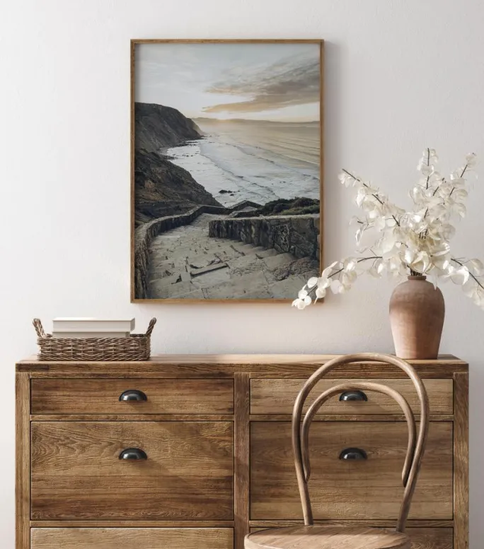 En herlig landskabsplakat med en vidvinkeludsigt over havet og en strand. Store stentrapper fører ned ad klippen mod stranden, der afspejler formen af landtangen i det fjerne. Bølgerne slår mod klippekysten i dette bløde pastelbillede.