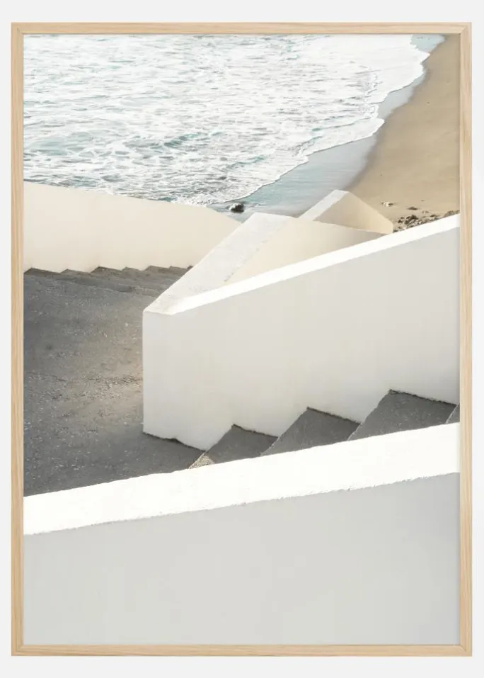 Denne plakat giver en følelse af både arkitektur og natur ved at vise en hvidtrappet struktur, der fører ned til en fredfyldt strand og det rolige hav. Spillet mellem lys og skygge på trinene, sammen med kontrasten mellem den stramme arkitektur og den bløde kystlinje, skaber et billede, der er både beroligende og visuelt interessant.