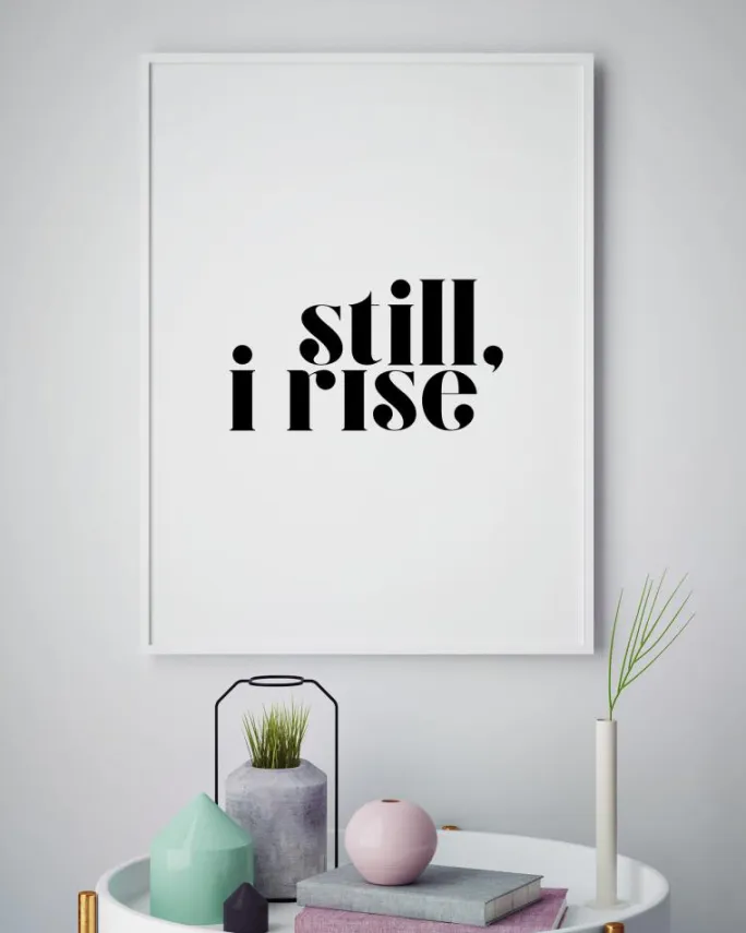 En inspirationsplakat med et dagligt bekræftelsescitat med stærke sorte bogstaver på en almindelig hvid baggrund. Giv dig selv kraft til at gå videre med sætningen Still, I Rise, mens du drikker din kaffe om morgenen og planlægger din dag.