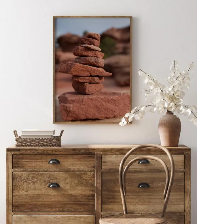 En plakat, der handler om balance. Små røde sten er omhyggeligt placeret i et tårn, hver enkelt på et bestemt sted, så de ikke vælter. Fokus er på dette lille tårn med flere sten og en blå himmel i det fjerne bagved. Brug dette kunstværk til at give næring til din inspiration.