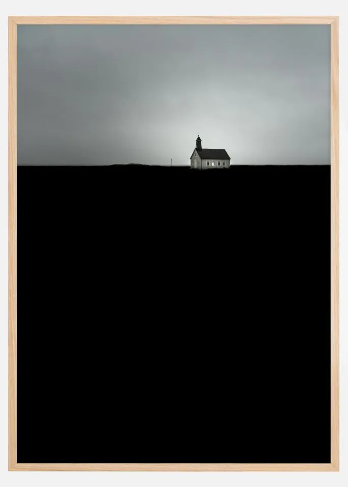 Denne plakat giver et stærkt og stemningsfuldt billede af Strandarkirkja, en ensom kirke, der står mod en dramatisk himmel. Landskabets mørke silhuet skaber en skarp kontrast mod den grå himmel, hvilket giver en følelse af isolation og stilhed. Kirkens hvide vægge lyser op i landskabet og tilbyder et symbol for håb og vejledning i det omgivende mørke.