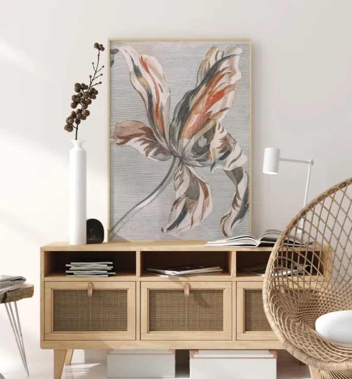 En blomsterplakat med en fed stribet blomst i rødt, hvidt og gråt. De flydende penselstrøg følger kronbladenes linjer for at skabe liv i værket. Sæt de stærke røde farver på væggen, hvor du hænger den, for at opnå en endnu mere levende effekt.